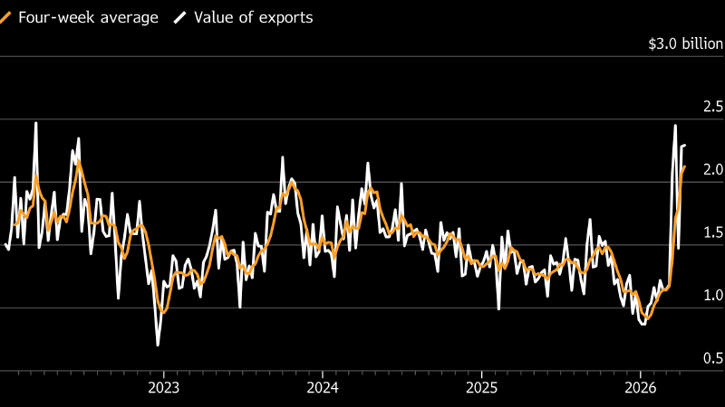 Стоимость морского экспорта нефти из РФ (млрд USD): оранжевым — среднее четырехнедельное значение, белым — недельное. Источник: Bloomberg