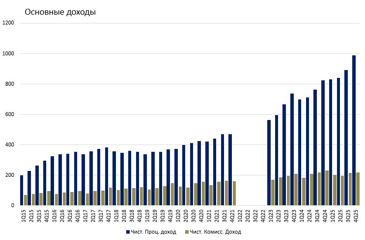 Второй крупный кусок дохода — это комиссионные доходы. Заработали 834 млрд за 2025 год, снижение в рамках -1% г/г. Здесь явно давит замедление потребления в целом из-за замедления экономики. По первым двум месяцам 2026 уже тоже показали снижение -3,7% г/г. Кажется, что пока что экосистемные сервисы вроде СберМаркета и прочих не дают ощутимого вклада в прибыль.