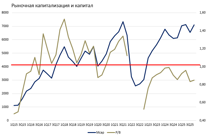 А вот в качестве негатива выступает сжатие NIM. Текущий NIM 6,2% — всё-таки аномально высокий показатель. Менеджмент сейчас ждет на 2026 год ~5,9%, но всё будет зависеть от динамики снижения ставки ЦБ. Потенциально чистые процентные расходы тогда могут упасть процентов на 10 при прочих равных. Вопрос в том, компенсирует ли рост объемов кредита и снижение CoR это сжатие.